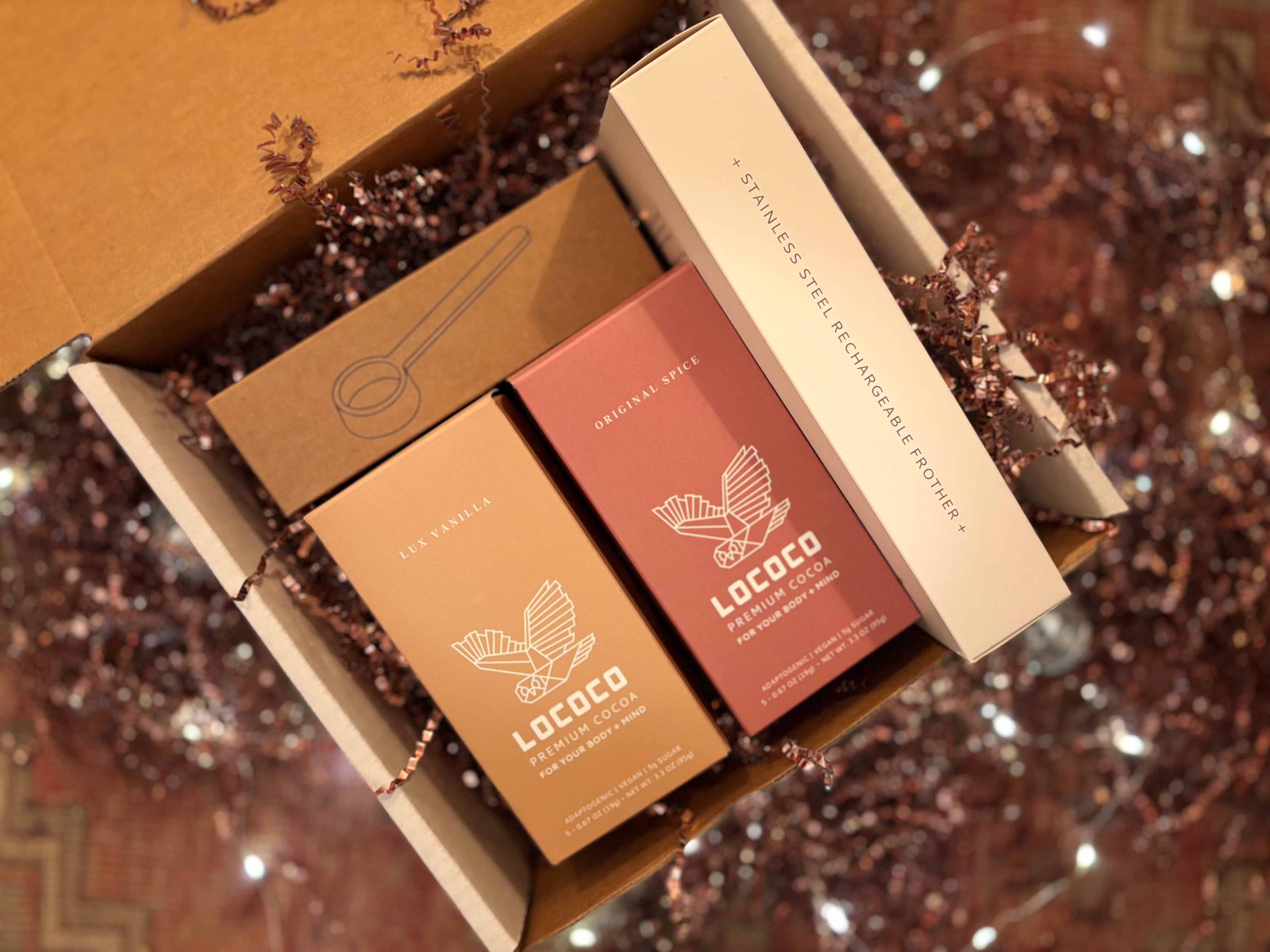 Both of our premium cocoas for your body + mind—LOCOCO® Original Spice and LOCOCO® Lux Vanilla—plus a frother and a scoop. The perfect starter set for yourself or a gift for someone special.