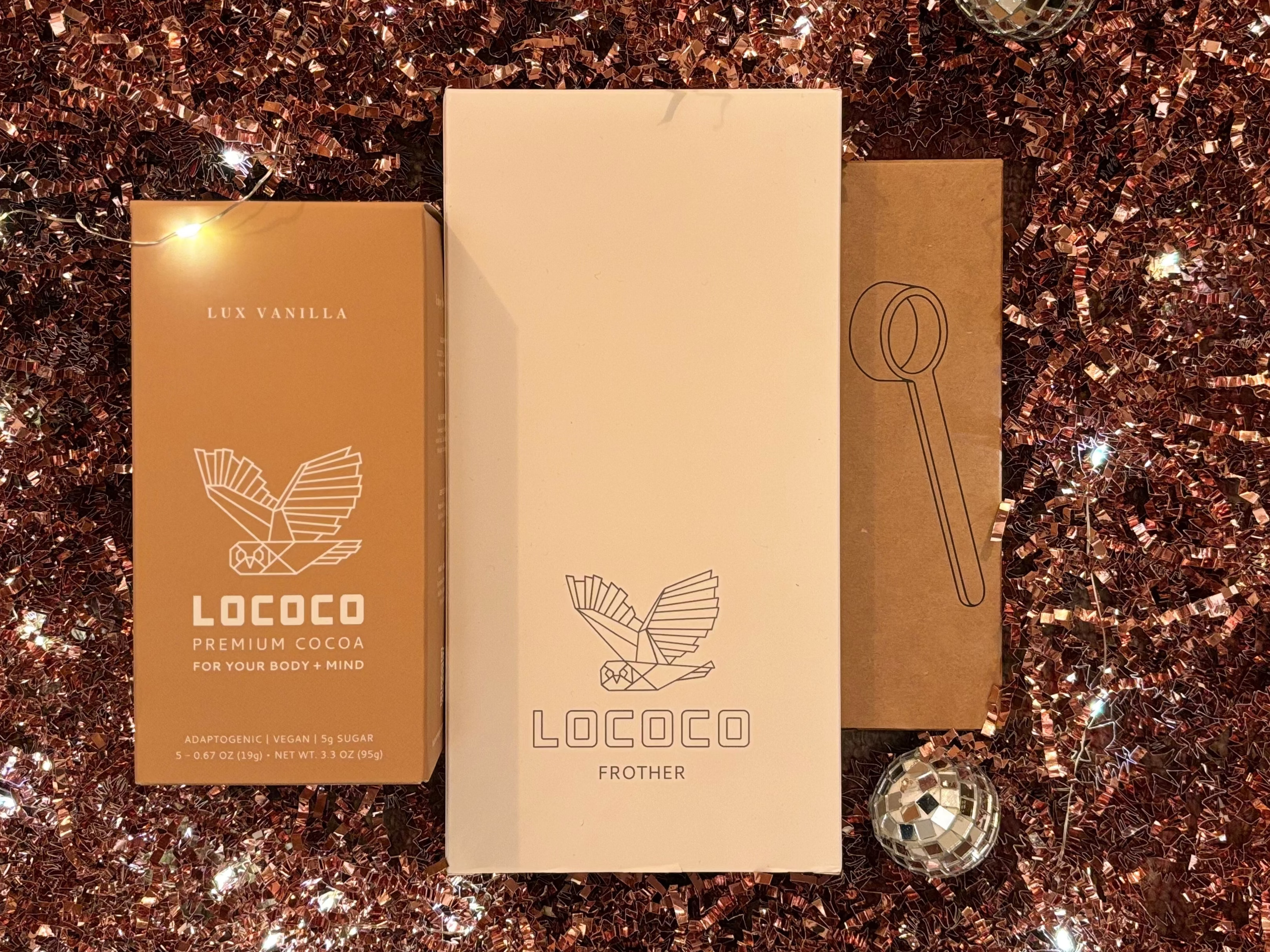 + LOCOCO® Lux Vanilla To-Go Sachet Box — 5 single-serve sachets of our new signature formula — a velvety vanilla cocoa with a dash of Utah-mined salt. Crafted by award-winning cocoa makers blended with functional mushrooms (Lion’s Mane, Cordyceps & Maitake), dairy-free coconut milk; lightly sweetened with coconut sugar and monk fruit.